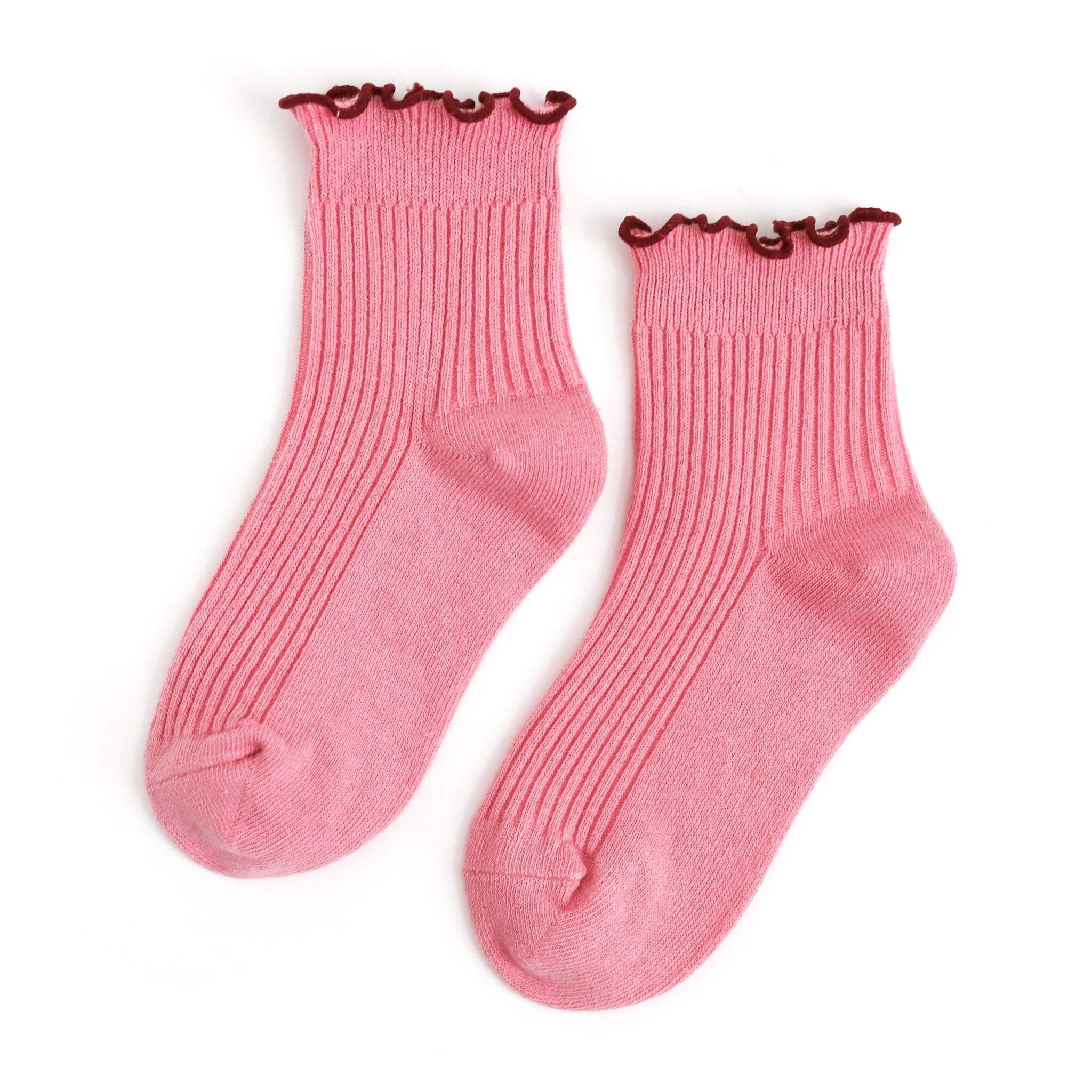 Ribbed Lettuce Trim Midi Socks - Pink/Burgundy