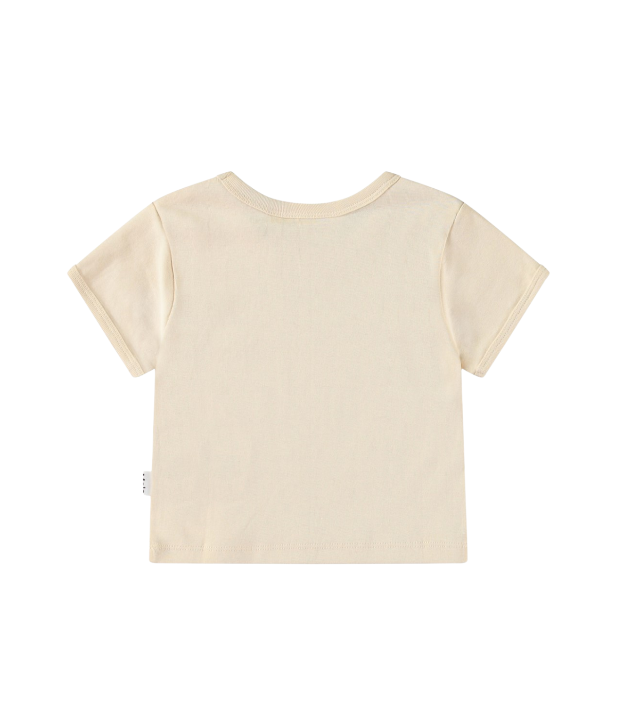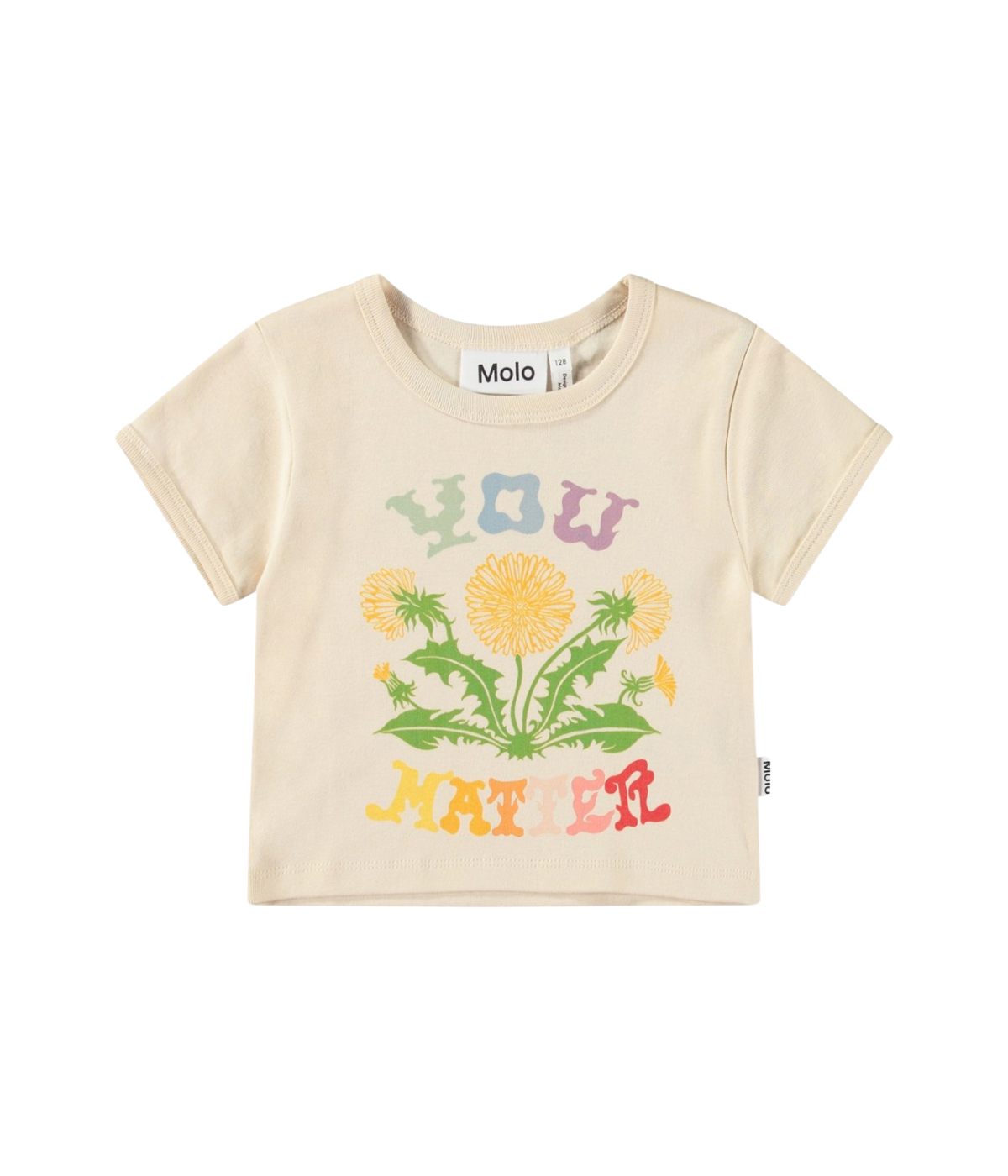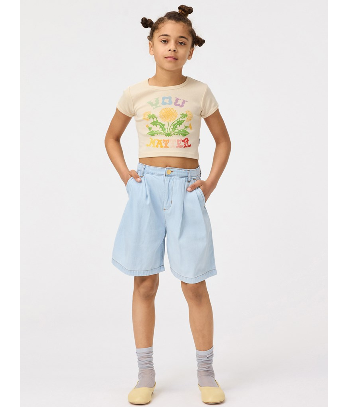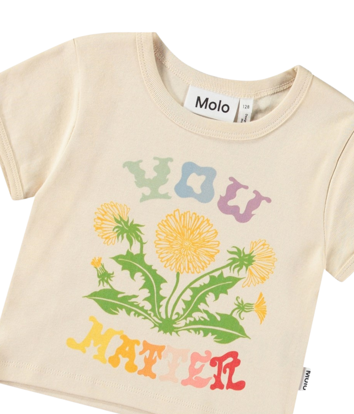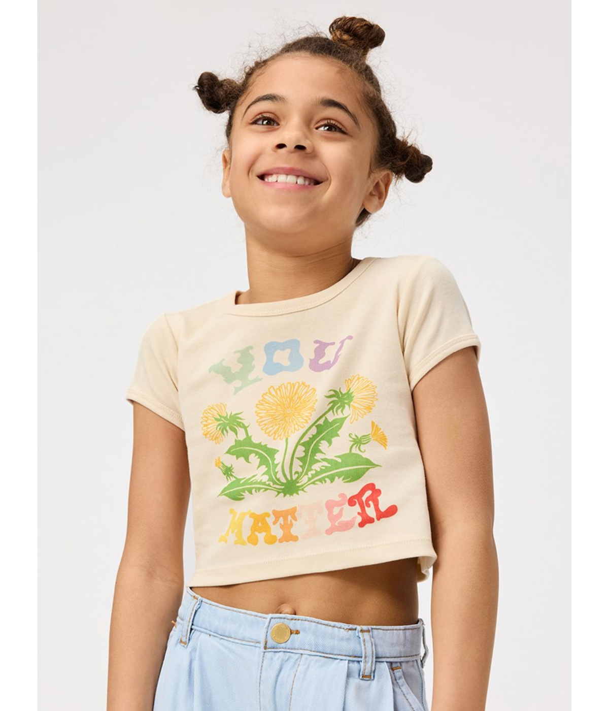 Beige cropped t-shirt in organic cotton with a round neck and ribbed edges. The t-shirt is fitted with a front print of blooming dandelions and the text 'You Matter'. Perfect for active kids, it keeps them cozy while reminding them that their voice and presence truly matter. Elevate their wardrobe with this inspiring and stylish tee.
