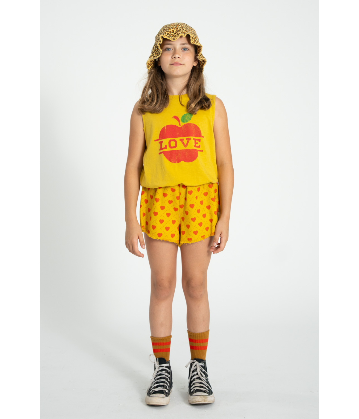 Strut your stuff in these vibrant mustard shorts that celebrate love in the most fun way possible. Covered in cheerful red hearts from top to bottom, they're impossible to ignore. The playful fringe detailing adds movement and personality to every step, making these shorts perfect for anyone who refuses to blend in.