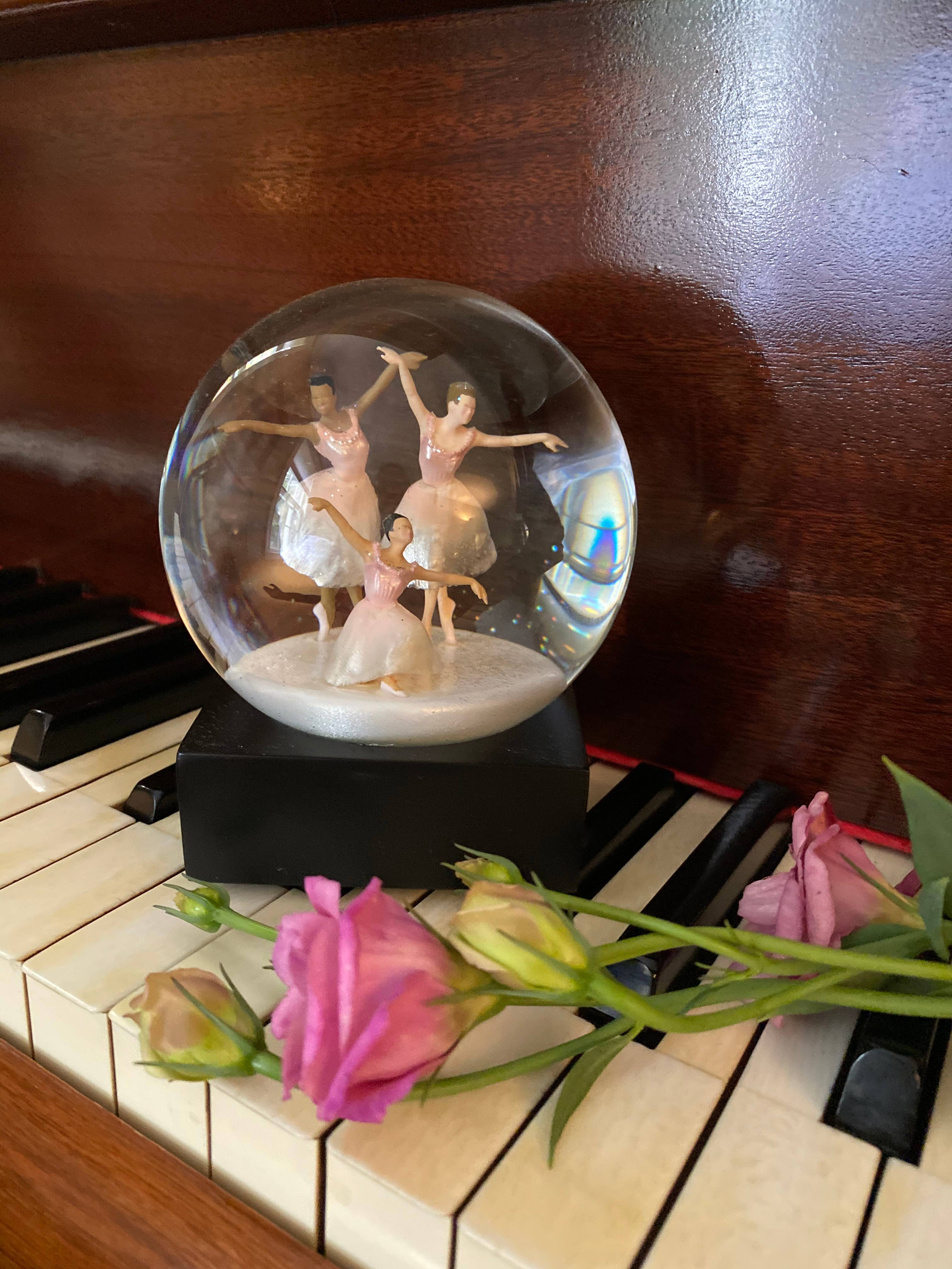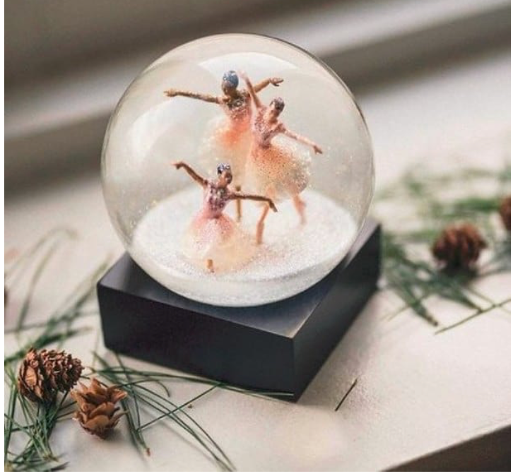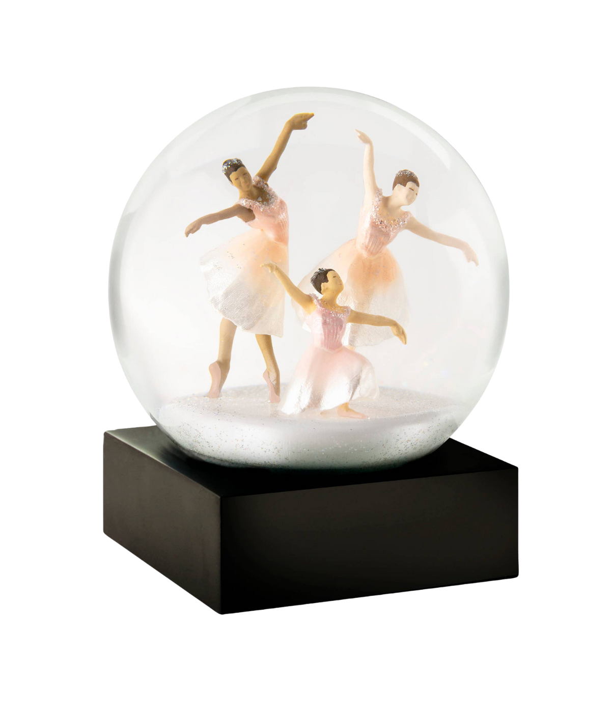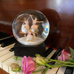 Reminiscent of another illustrious trio, the Three Graces, these dancers epitomize elegance, beauty, and delight. Emerging from a sparkling flurry, the ballerinas are poised to take off and move gracefully to the Nutcracker’s Dance of the Reed Flute—or perhaps just the faint percussion of the falling snow. Glass globe on our Iconic Square Black Base