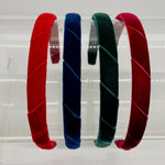 This headband is hand-wrapped in high quality velvet ribbon that is approximately 5/8 inches wide. Comfortable and classic. It is wearable year around.