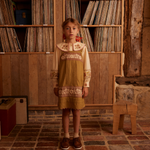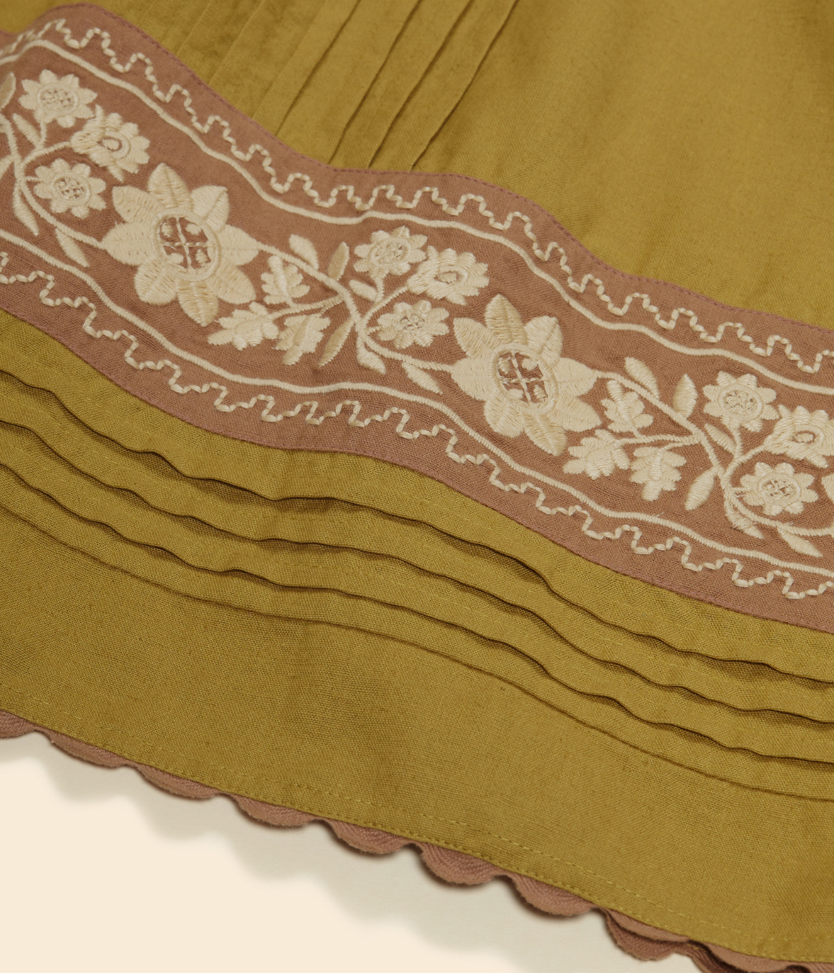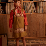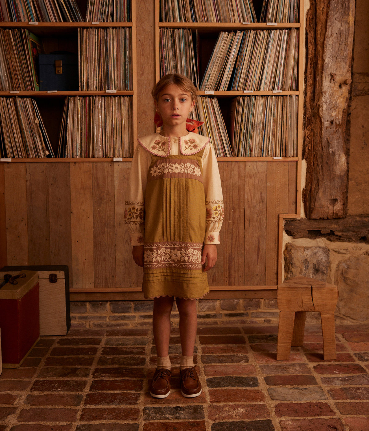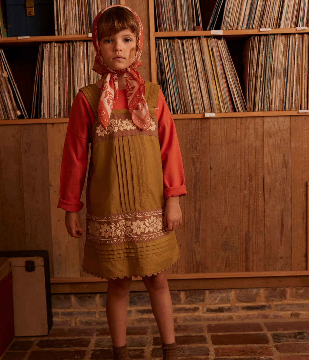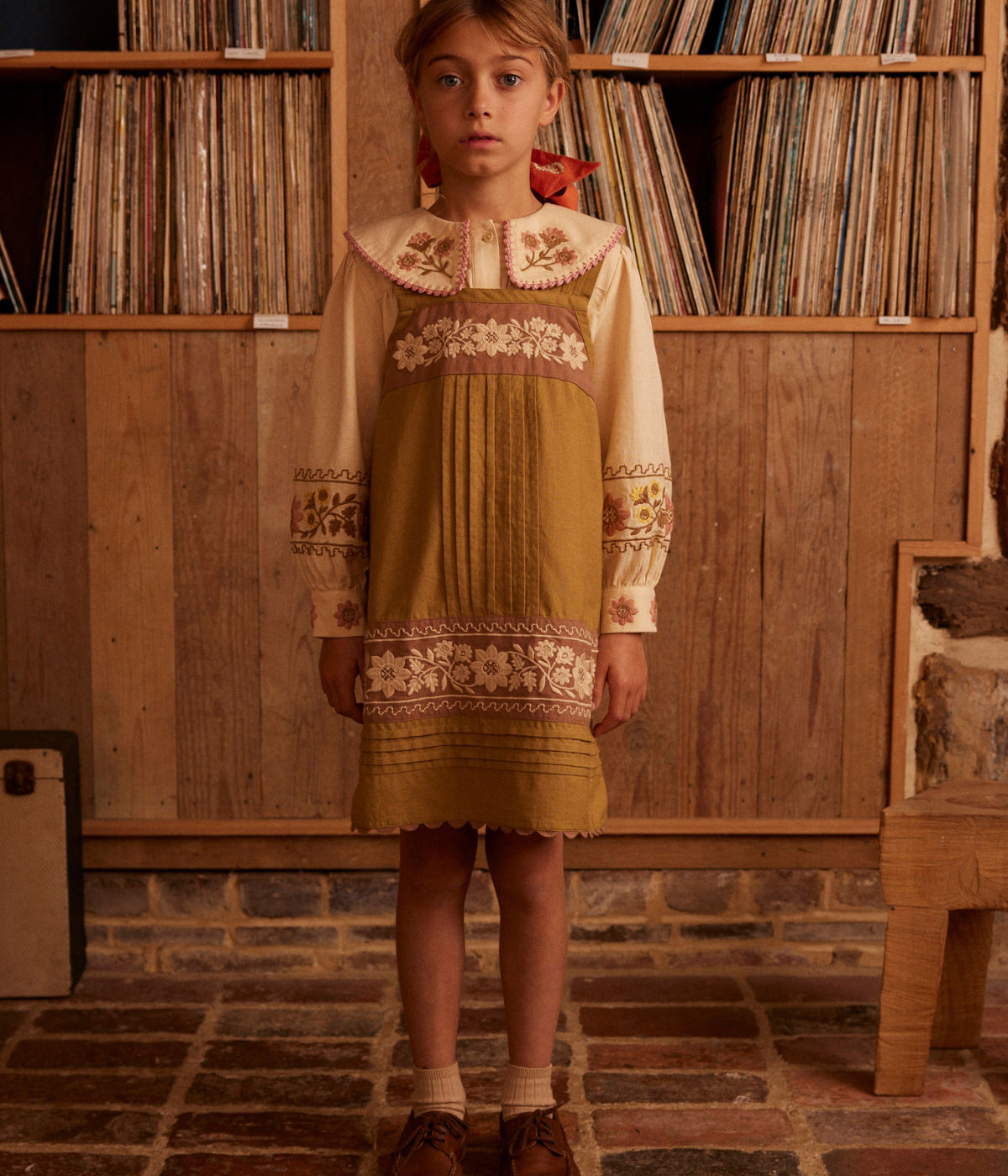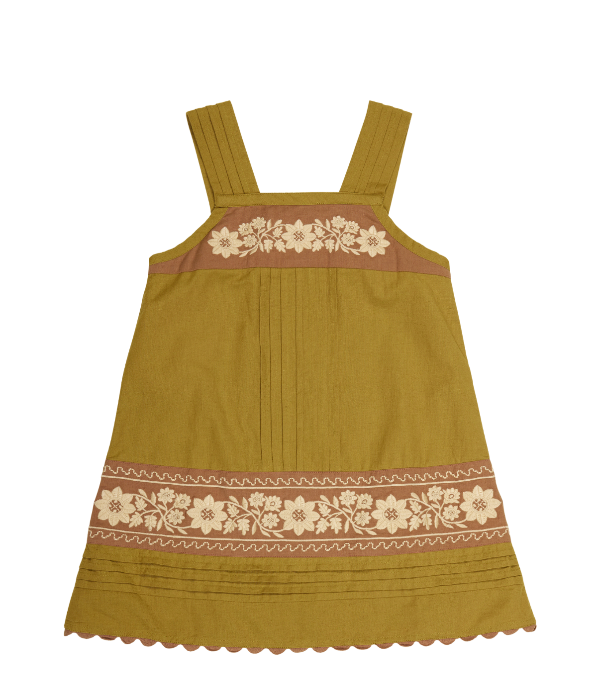 The Vittoria apron shift dress is a retro-inspired design with a charming Scandinavian mood. Crafted from ‘dried moss’ cotton-linen, it features pintucked straps and skirt, contrast panels adorned with floral embroidery, and a ric rac trim at the hem. Finished with a three-button back fastening, this sweet style layers perfectly with seasonal blouses or simple jersey tops. Add Vittoria to your little one’s everyday wardrobe for effortless charm.