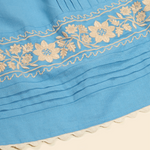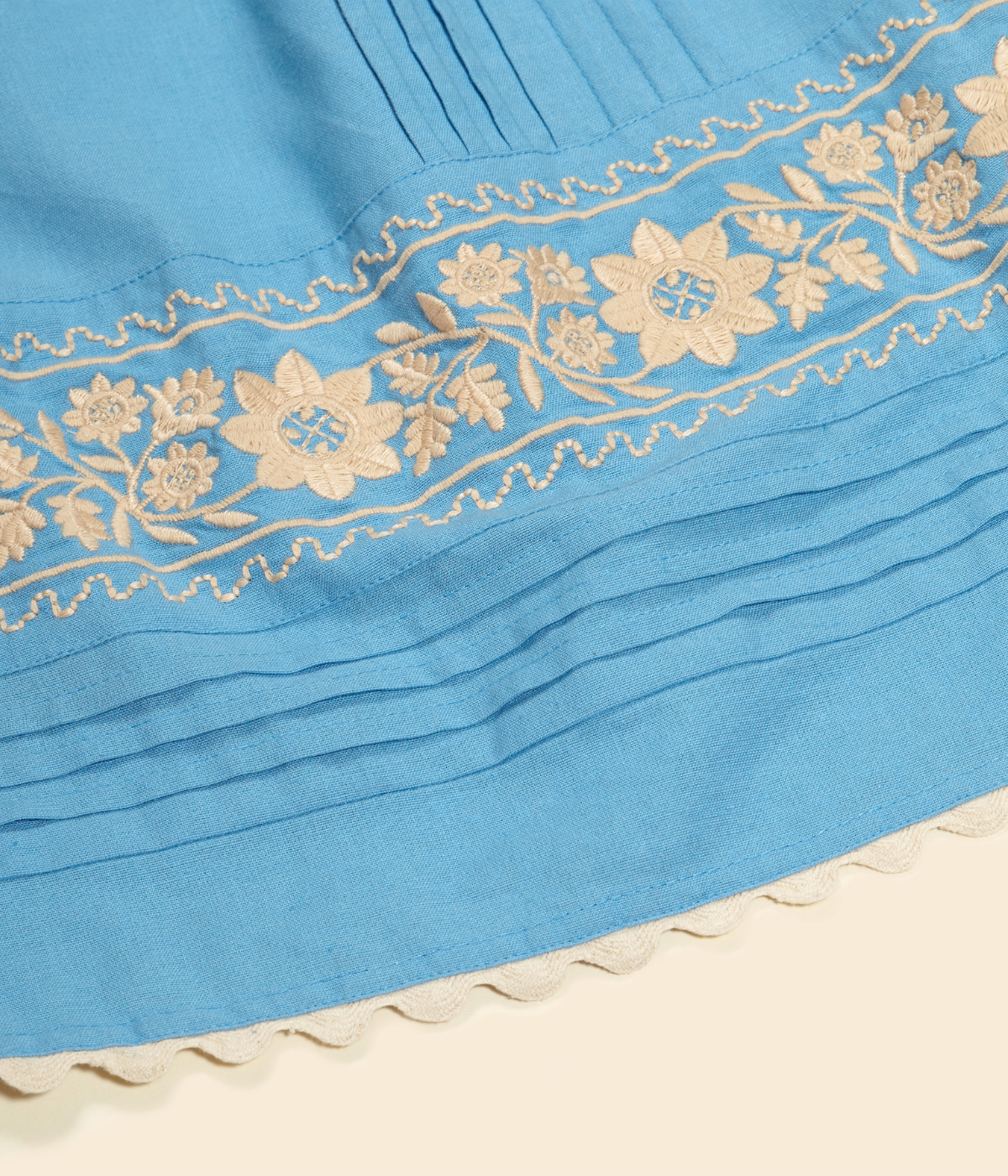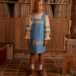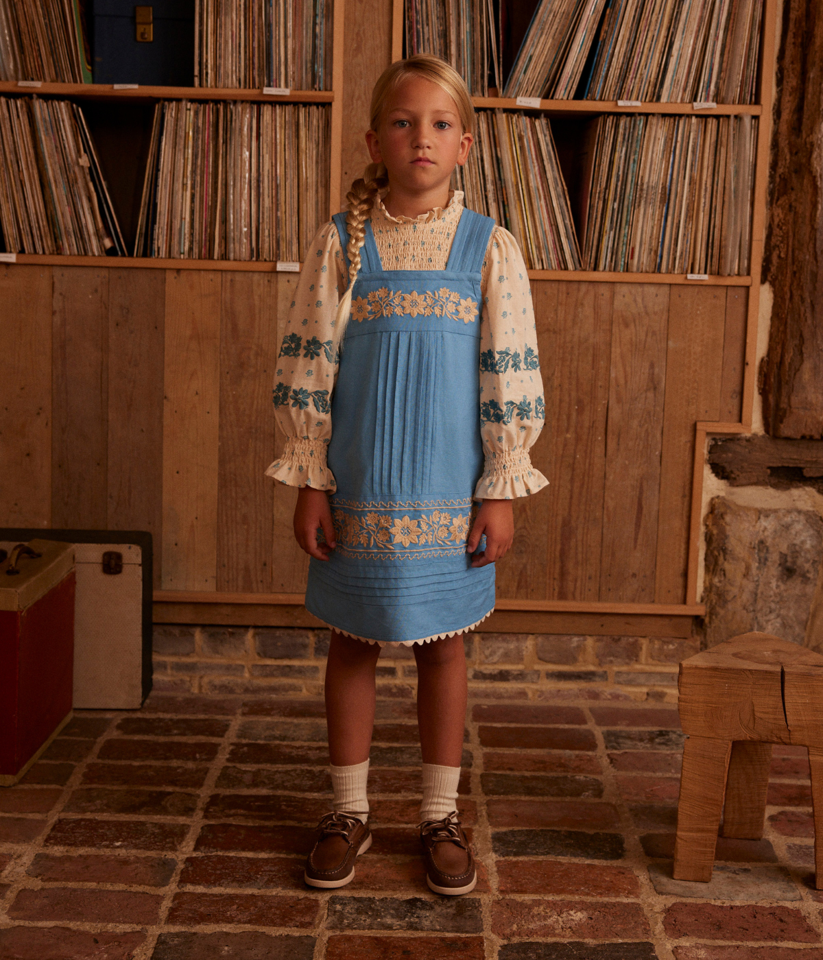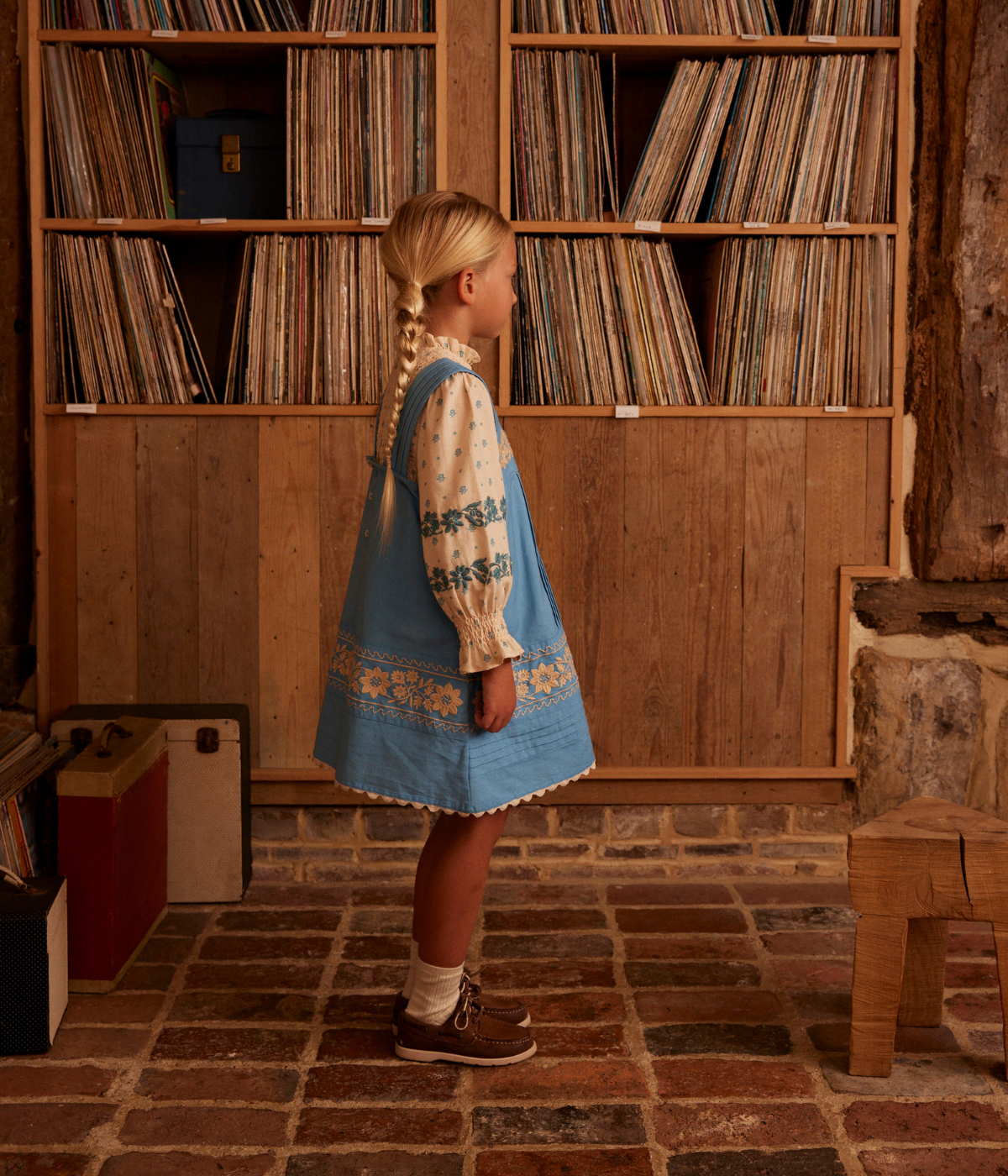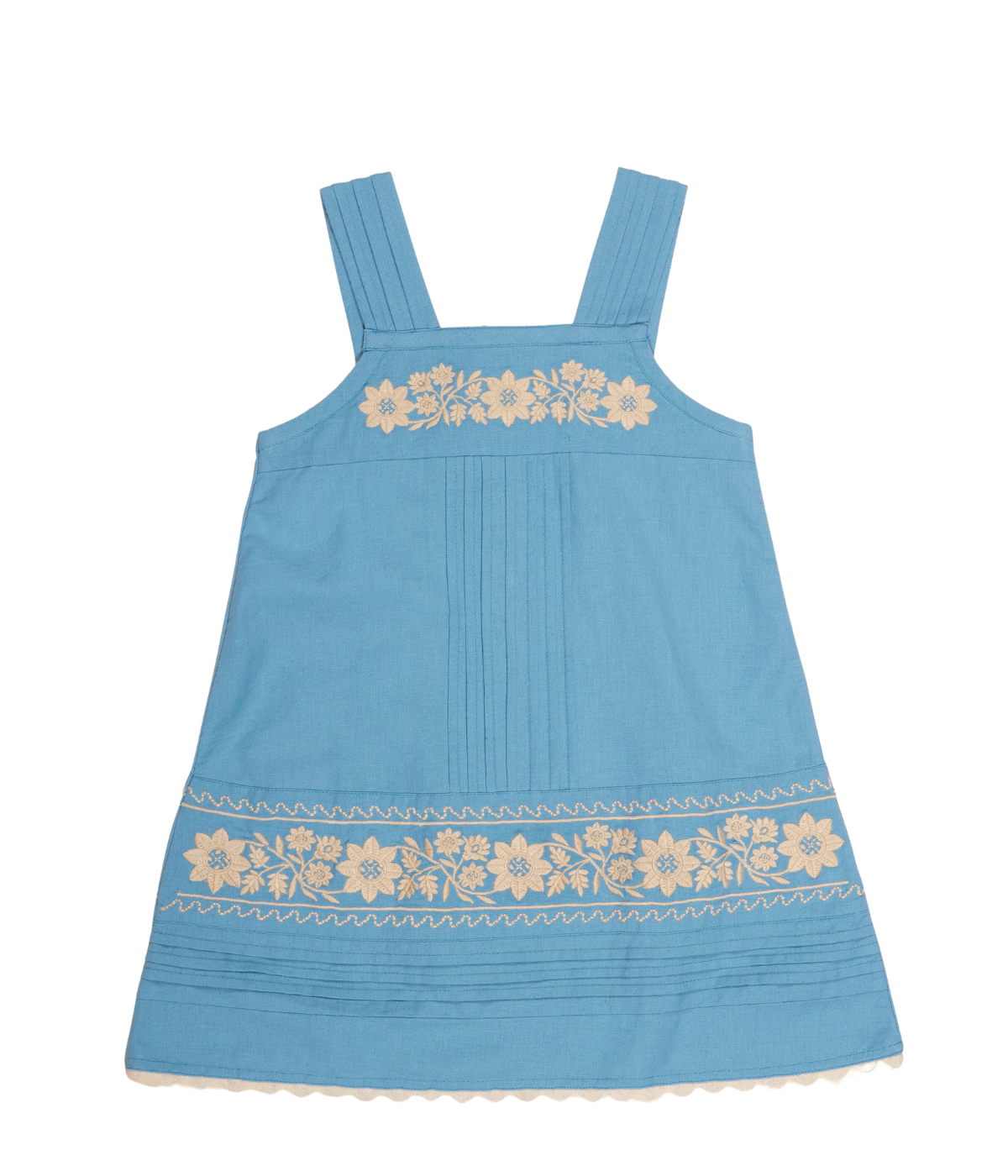 he Vittoria apron shift dress is a retro-inspired style with a charming Scandinavian mood. Crafted from ‘Nordic blue’ cotton-linen, it features pintucked straps and skirt, delicate floral embroideries at the chest and hem, and a contrast ric rac trim. Finished with a three-button back fastening, this sweet piece layers beautifully with seasonal blouses or simple jersey tops. Add Vittoria to your little one’s everyday wardrobe for a touch of timeless charm.